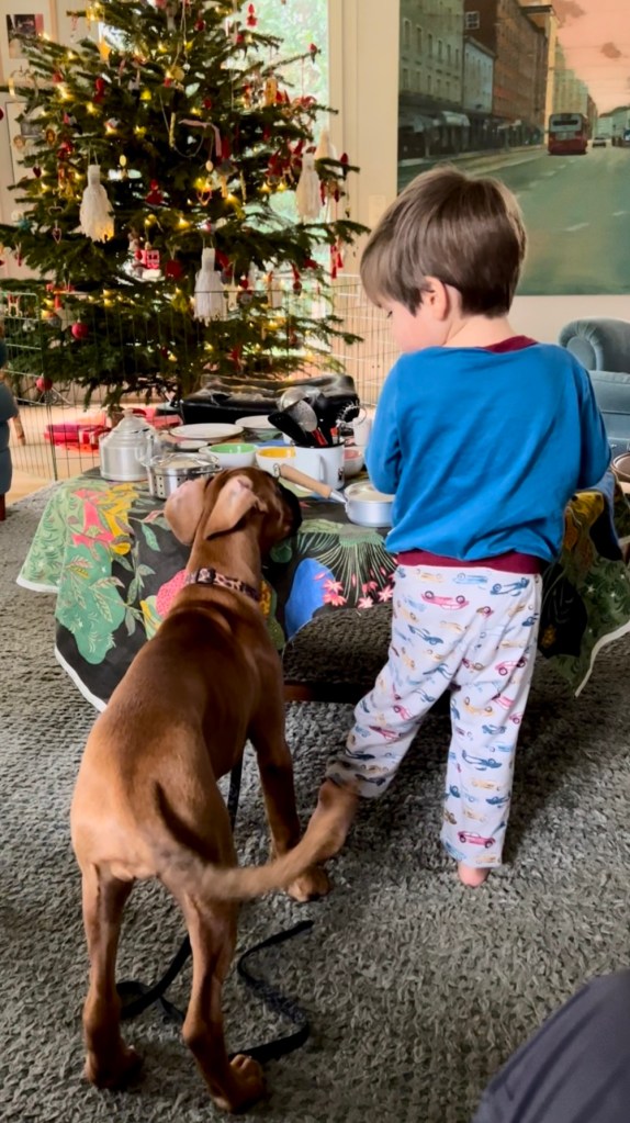 He runs up to me and cries “I want to play with Puppy Helga”. He doesn’t even care if I, (accidentally) jump on him. He just stands right up again.
