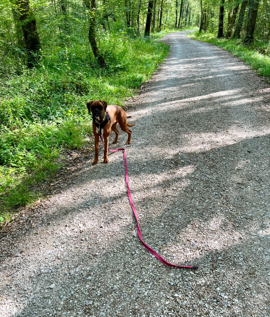 There we were, out in the woods, training recall with the leash on. (Us dogs are not allowed to run free at the moment)